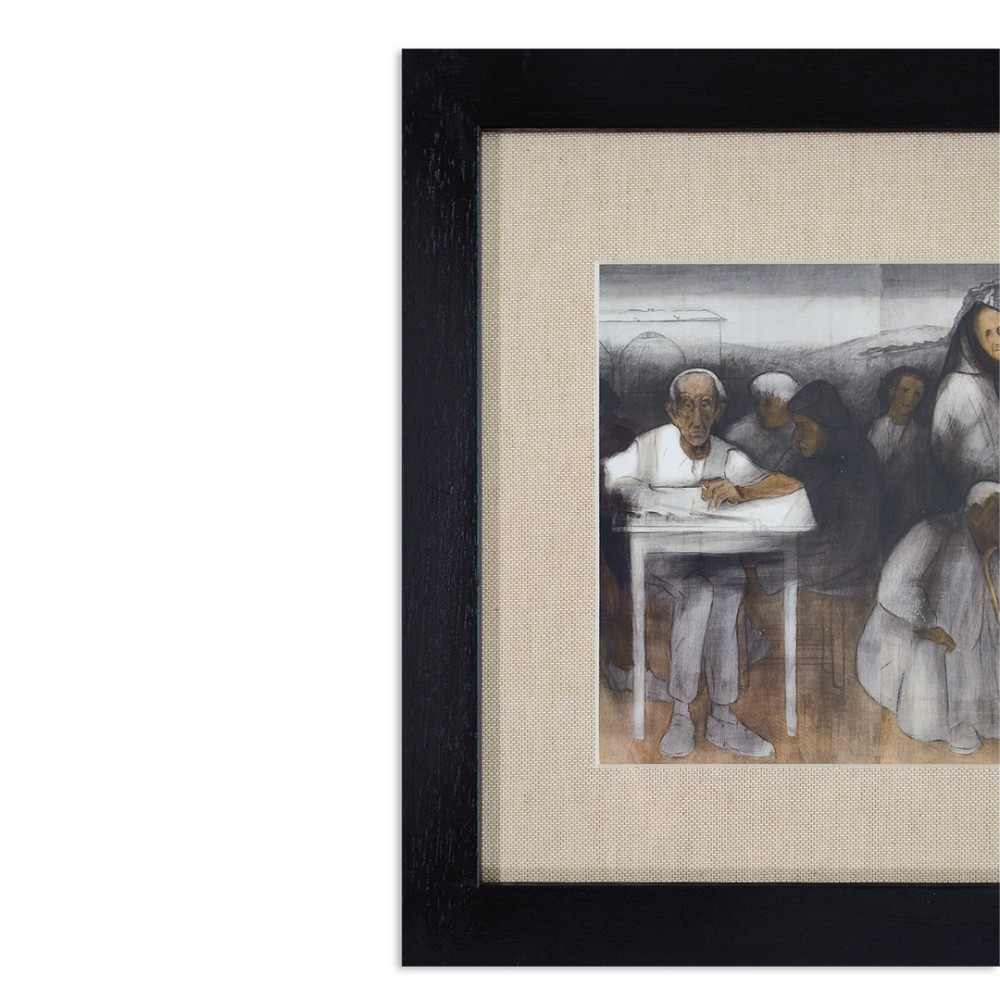 As can be seen in this detail, Diamantis placed emphasis on line in this composition, using colour to highlight the overall effect of the drawing. For his choice of palette, he reconciled his aesthetic approach with the austere colours of traditional Cypriot clothing: black and white. Diamantis chose an earthy brown for the third colour, to instil the work with the needed warmth and because this colour symbolises the deep connection between the Cypriot villager and the land.