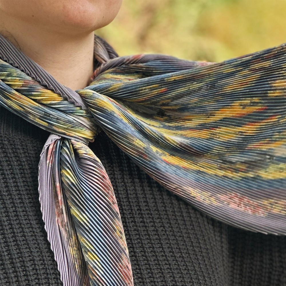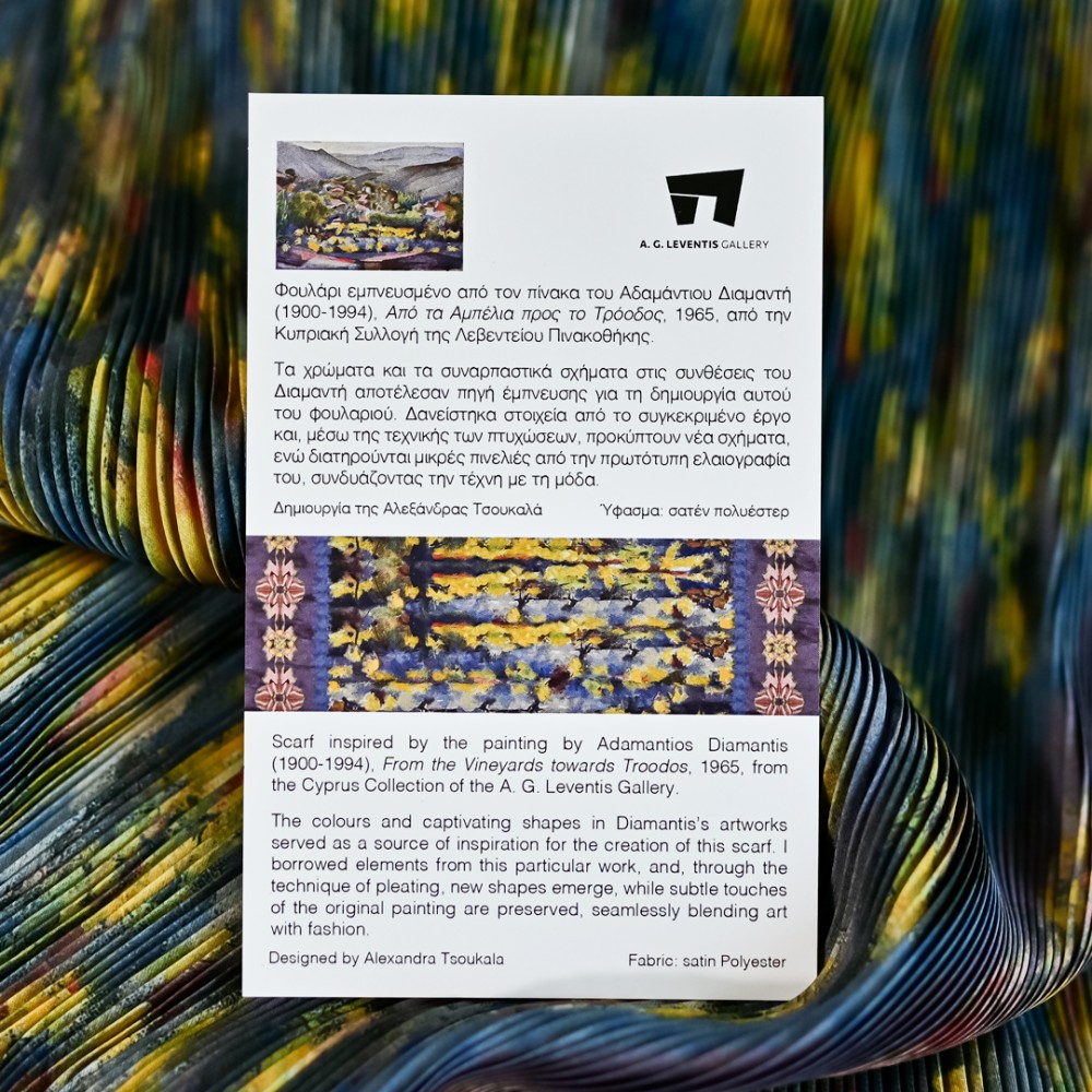 The colours and captivating shapes in Diamantis’s artworks served as a source of inspiration for the creation of this scarf. I borrowed elements from this particular work, and, through the technique of pleating, new shapes emerge, while subtle touches of the original painting are preserved, seamlessly blending art with fashion.